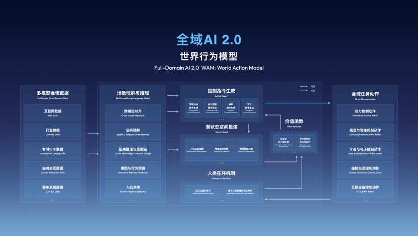 与行业常见的模块化拼装思路不同,千里浩瀚选择了一条更具纵深的技术路线。以WAM世界行为模型为核心,构建覆盖感知、预测、规划与决策的一体化“整车大脑”。这一拥有1000亿级参数的大模型架构,打破了传统智驾与智舱之间的域控割裂,实现跨系统协同的全局理解与统一决策。这种架构升级的意义在于,它推动智能驾驶从“规则驱动时代”迈向“模型驱动时代”。Smart AI Agent架构通过将VLA车端大模型与世界模型深度协同,一方面利用云端仿真实现持续学习与策略优化,另一方面依托车端算力完成实时推理与即时决策,形成真正意义上的“双重智慧闭环”。